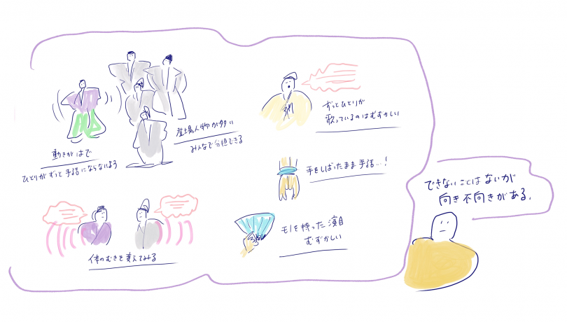 個々の部分の意味がわからなくても、そもそも、すべてを理解させるように能狂言は作られていないんじゃないかというのが私の考えです。わからない部分、あれ、なんだったんだろうという余白があるのが能狂言のいいところ。その余白に疑問を感じることによってより深みにはまっていくような、あえて型を崩さずにやることで、あれは手話ではないし、狂言の型なのかな、なんだろうか、と思っていただけた方が私は嬉しいかなと思います。