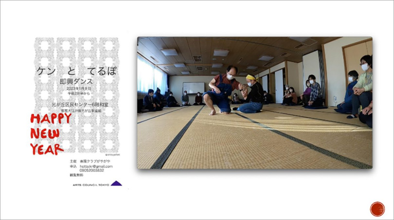 「ケンとてるぽ 即興ダンス」2023年 光が丘区民センター6階和室 他にもいろいろな歌をつくって「あっちでがやがや、こっちでがやがや2022」では、「馬喰町バンド」の武徹太郎さん、「つむぎね」の横手ありささん、野田さん、中村桃子さんとつくった新曲3曲をYouTubeにアップしました」
