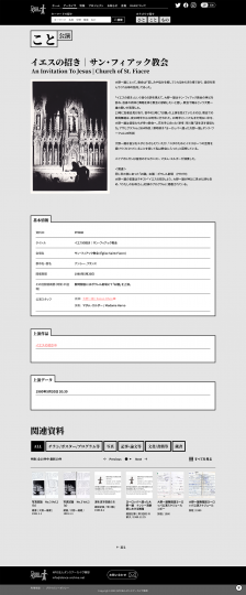 資料ページには、作品についての説明とともに、公演が行われたフランス・ナンシーの教会の写真が掲載されている。ページ下方へスクロールすると、作品タイトル、制作/公開年、出演者・スタッフ等の基本情報、さらに上演履歴が続く。