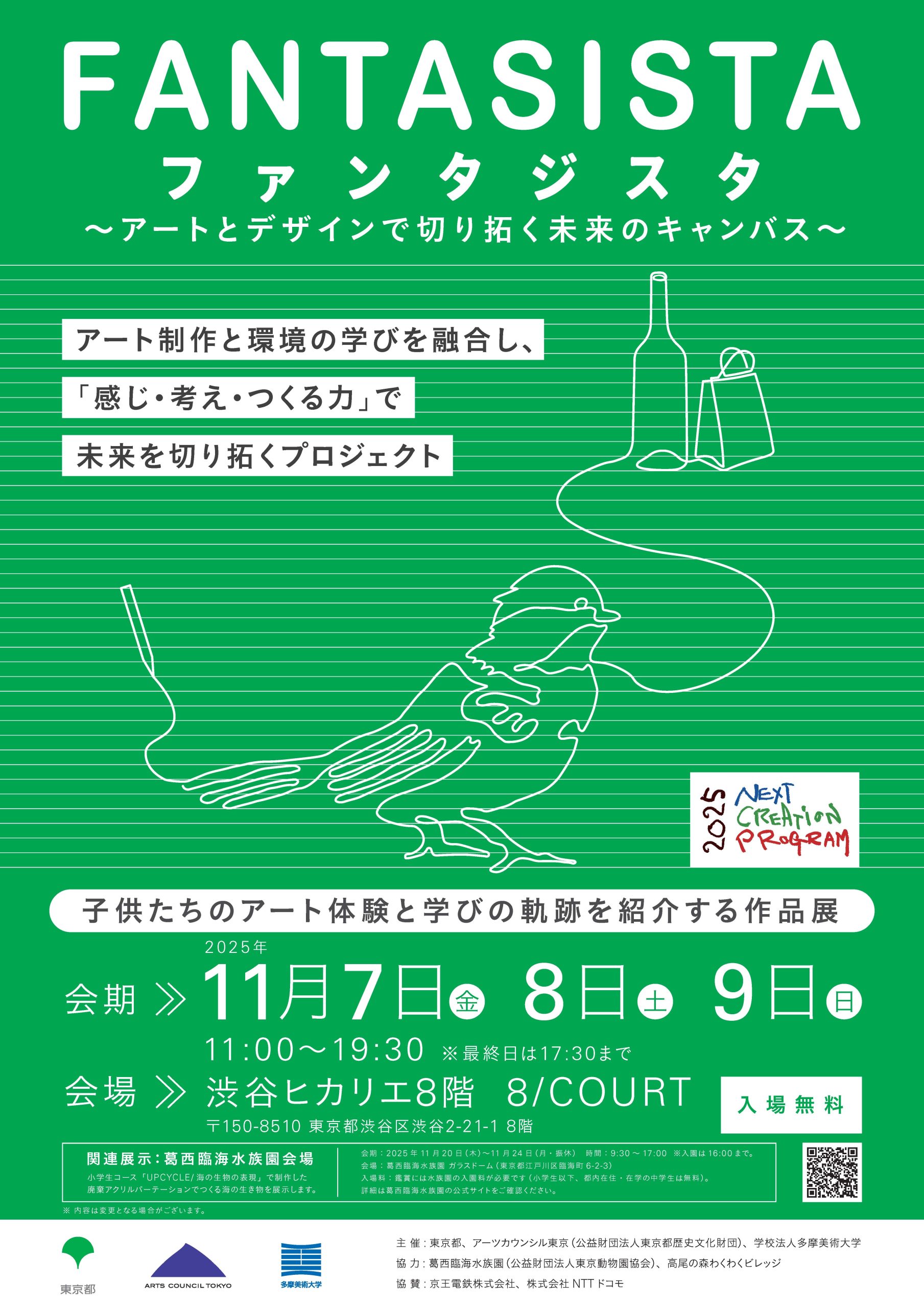 東京都・アーツカウンシル東京・多摩美術大学が主催するネクスト・クリエイション・プログラム「ファンタジスタ~アートとデザインで切り拓く未来のキャンバス~」は、アート作品制作を通してアート教育と環境教育を融合し、未来をつくる「創造する力」を育むプログラムです。アートにある「正解のない課題に挑む力」と、環境教育にある「大きな課題に粘り強く向き合う力」。その二つを結び合わせ、柔軟な思考と前向きに進む意志を育ててきました。本展示では多摩美大生も伴走した子供たちの芸術文化体験と学びの軌跡をご紹介します。