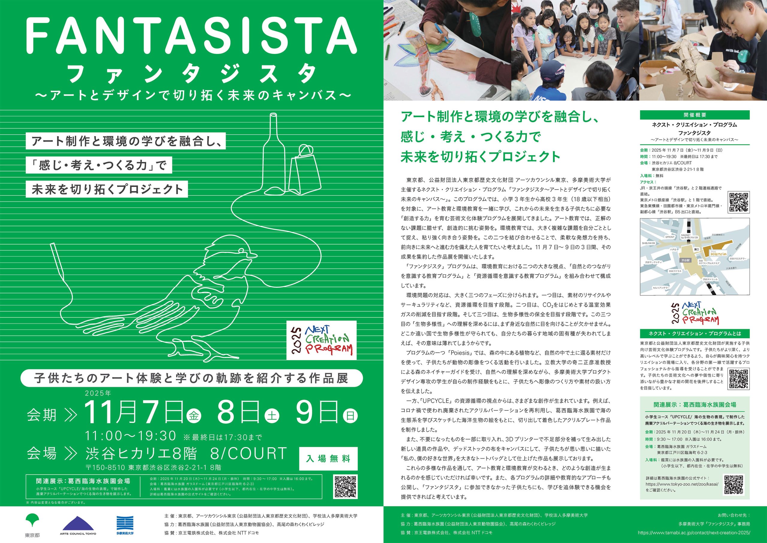 東京都・アーツカウンシル東京・多摩美術大学が主催するネクスト・クリエイション・プログラム「ファンタジスタ~アートとデザインで切り拓く未来のキャンバス~」は、アート作品制作を通してアート教育と環境教育を融合し、未来をつくる「創造する力」を育むプログラムです。アートにある「正解のない課題に挑む力」と、環境教育にある「大きな課題に粘り強く向き合う力」。その二つを結び合わせ、柔軟な思考と前向きに進む意志を育ててきました。本展示では多摩美大生も伴走した子供たちの芸術文化体験と学びの軌跡をご紹介します。
