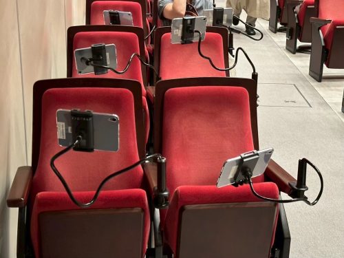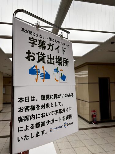 - 字幕タブレットの貸出、台本の貸出(紙またはタブレット)、受付での手話通訳と筆談、出演者挨拶の手話通訳と文字起こし、聴覚情報補助機器の貸出、車椅子対応、ほじょ犬対応