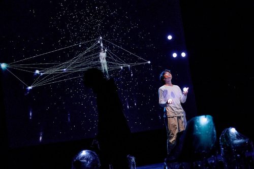 ジャグリングされるボールと身体の動きの軌道を取得し、それをリアルタイムに生成されたCG映像で演出することで「ものと身体の間に発生するエネルギーの動き」を強く感じさせたり、古い椅子や扇風機などの「もの」とかかわる姿を提示することで、そういったものにも何かしら魂のようなものがあるのでは、ということを伝えたりといったシーンを作成し、ジャグリングという手段と視点を用いて、様々な見えない繋がりを感じさせるような作品を目指した。