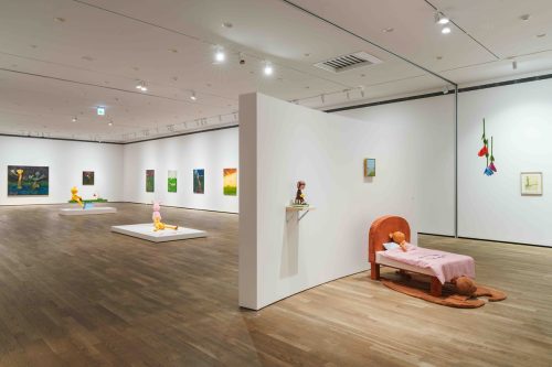 本展では、陳威廷による近年の創作の流れを紹介する。詩を出発点とし、絵画、リトグラフ、インスタレーションなど複数のメディアへと展開される表現言語に焦点を当てている。作品の多くは、日常的な風景や幼少期の記憶を基盤とし、架空のキャラクターやオブジェクト同士の関係性を通じて、感情の曖昧さや時間の断裂感を帯びたイメージの物語を構築している。展覧会タイトル「ひとすじの灰色」は、明と暗、確実性と不確実性のあいだに存在する状態を象徴しており、作家が一貫して探求してきた「感情の余白」や「存在の曖昧な境界」への応答でもある。画面に描かれる人物たちは、しばしば「待つ」「彷徨う」「ためらう」といった姿勢をとり、人間関係、言語、知覚、記憶といったテーマに対する長年の考察を反映している