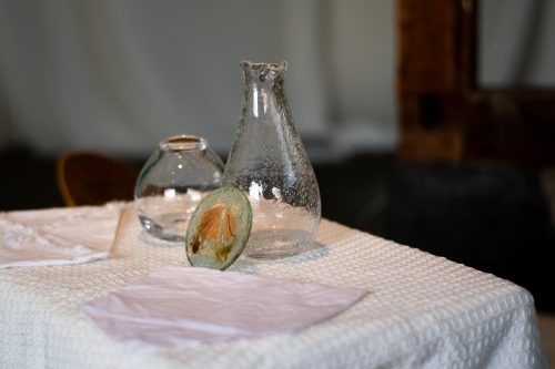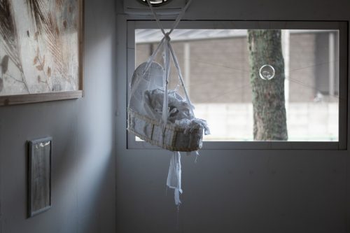 本展では、海草アマモの生態と「おくる/おくられる」という行為を手がかりに、刺繍、絵画、吹きガラス、テキスタイルなどを用いたインスタレーションを発表した。海辺でのピクニック形式のフィールドワークや作家間の対話を通じて、流産や喪失、身体の記憶といった個人的体験を静かに掬い上げ、生命の循環と重ね合わせる表現を試みた。展示空間の構築においてはインストーラーと協働し、素材や光の配置を調整することで、鑑賞者が自身の記憶や感情に触れる「追体験の場」として空間全体を構成した。自然環境と身体性のあいだに生まれる関係性を再考し、個々の内面に寄り添う場を提示する展示となった。