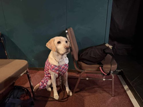 バックステージツアーに参加中のご主人を見守るアイメイトのラッキーちゃん