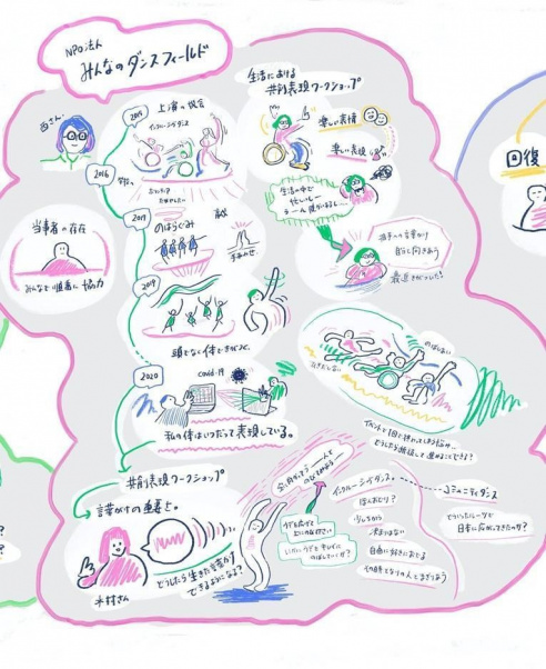 英国留学中にインクルーシブダンスと出会い、2020年に「みんなのダンスフィールド」のメンバーとなった水村麻理恵さんは「自由な世界が生まれる言葉がけに挑む」というテーマで発表した。水村さんが「言葉」に注目したのは「初めて西先生のワークショップに参加したときに、その言葉の〈広さ〉と、そこから生まれる表現の〈自由さ〉に驚いたから」だと言う。例えば、一般的なレッスンでは腕をきれいに伸ばすために「腕を大きく広げて上に伸びてください」と言うところ、西さんのワークショップでは、「空に向かってうーんと伸びてみよう」と言葉をかける。「そうすると、天井や壁という現実の空間から世界が広がり、からだの特性で上に伸びることができない方も、空であればどこにでも伸びていくことができるんです」。