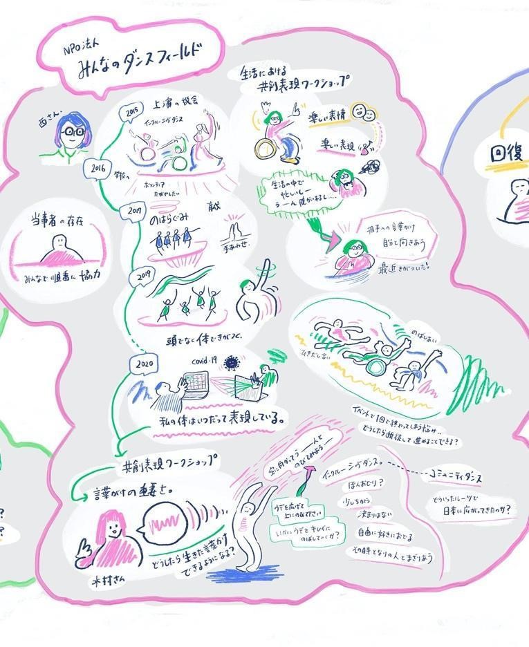 その次年度からはもっと知らないところへ行ってみようと、小学校や特別支援学校での教育ワークショップとボランティア「耕し隊(たがやしたい)」育成ワークショップに踏み出す。そこからインクルーシブダンスの創造過程で生まれる「共創表現の現場」を社会に広めたいという思いが強くなる。2017年には、子どもの頃から活動を続けて大人になったメンバーで「のはらぐみ」という別のユニットを結成して、社会に向けた活動に取り組む。さらに、こうした共にアート表現をつくり合う「共創」とその環境づくりを推進する人材「共創表現ファシリテータ」を育てようと考える。そこで、共創社会と人材の育成を目的に据え、年間を通して都内各所で研究会や創作・発表を繰り広げる「ワーク・イン・プログレス 『共創表現ファシリテーションに挑む』ー研究・創作・社会実践は循環してすすむー」を計画し、令和2(2020)年度第1期「芸術文化による社会支援助成」に採択された。