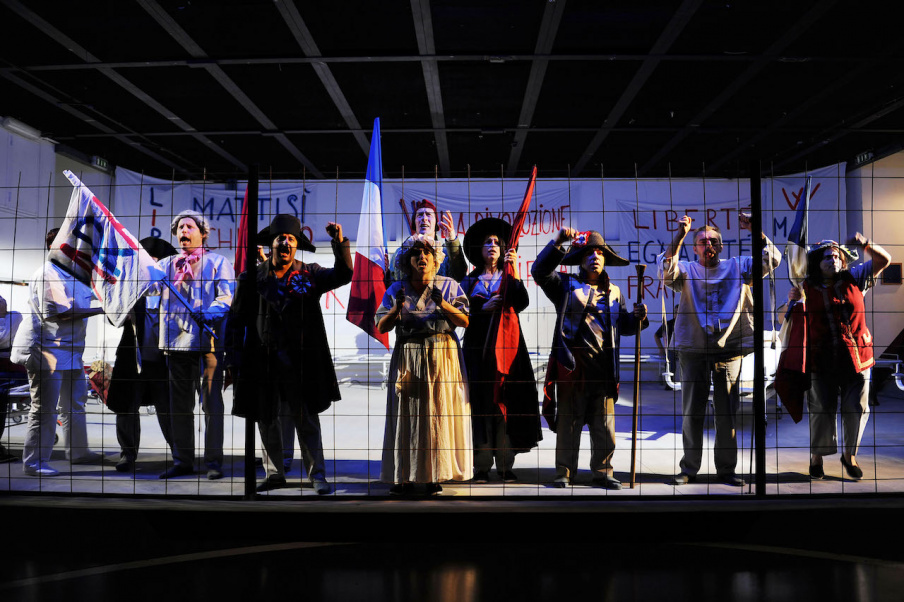 『マラー/サド』の原作は、1964年初演のペーター・ヴァイスの戯曲で、1967年にはピーター・ブルック監督が映画化もしている。フランスのシャラントン精神病院に収監されているマルキ・ド・サド侯爵が、患者たちを使い、フランス革命指導者であり、後にシャルロット・コルデーによって浴槽で刺殺されるジャン=ポール・マラーのドラマを描くという劇中劇。この物語を、アルテ・エ・サルーテ劇団の舞台では、実際に精神障害により社会からの疎外を経験した俳優たちが、芸術的な感性と巧みな演技力で、革命や自由を表現しているのだ。