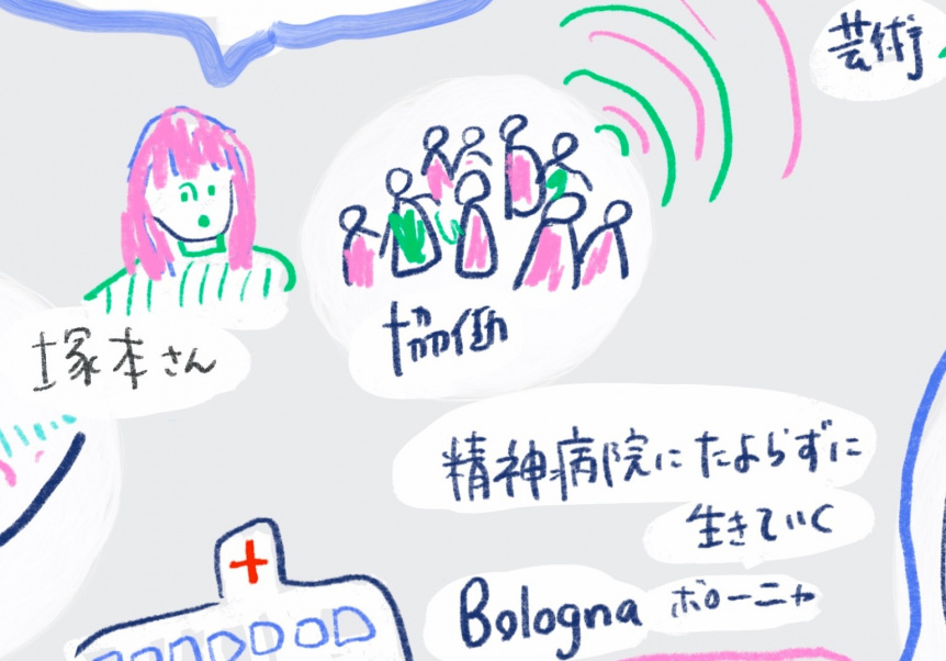 その背景を事務局の塚本さやかさんが説明する。日本は世界で一番、人口当たりの精神科の病床数が多い国だという、ショックを覚えるデータがある。「精神科病院に入院している27万人のうち約7万人はいわゆる〈社会的入院〉、地域での受け入れ先さえあれば退院できる人であり、つまり地域に居場所がなく、戻り先がないから入院している。一方、イタリアでは1978年に精神科病院を撤廃し、地域精神保健サービスをはじめとする地域サービスによって障害のある当事者たちを支えています。そこで、どんなサービスがあったら、日本でも地域の中で障害を持つ人が当たり前に暮らせるだろうと、都市交流事業として、イタリアの事例を学びにリサーチに行きました」。