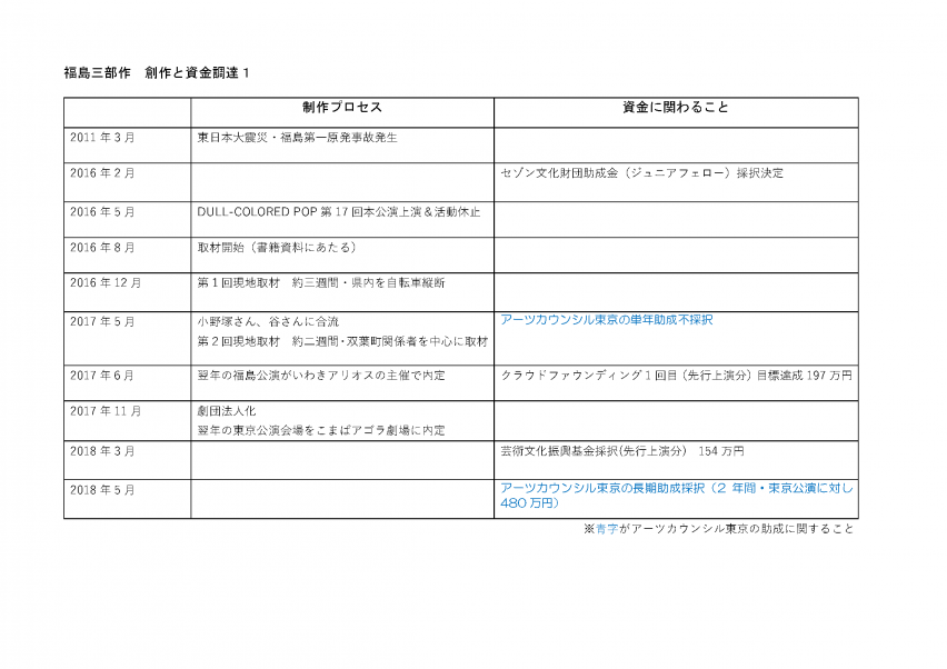クラウドファンディングと併行し、アーツカウンシル東京の助成申請(単年度/不採択)、芸術文化振興基金への助成申請(154万円)と、公的助成を使った資金調達も進めた。2017年11月には合同会社DULL-COLORED POPを設立。これは契約や支払いをスムーズにするだけでなく、任意団体のままでは助成金申請ができないといったケース、契約の際に源泉徴収を引かれるといったデメリットを踏まえての決断だった。「うちの劇団はそれまで、あまり積極的に助成金申請をしてこなかったこともあって、法人化を先送りにしてきたんです。ただ、三部作をやることが決まって、福島公演もできそうという話になった時に、やっぱり任意団体だと劇場との契約上支障が出てくるということがあって。なかなか大変なことではありますが、これはもう、会社としてやろうと踏ん切りがつきました」(谷)