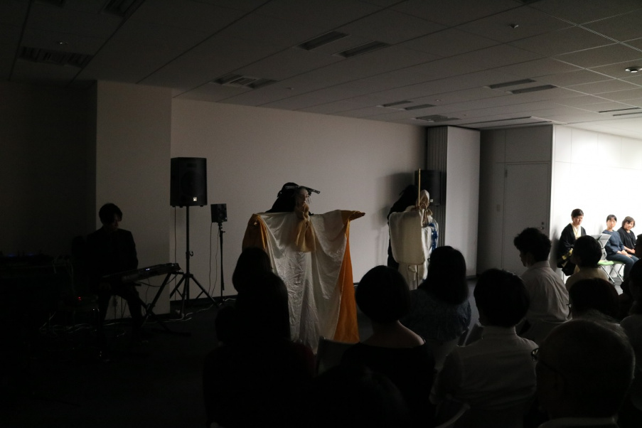 プレ公演の直後からプロジェクトに参加する音楽家ヲノサトルは、自身の扱う電子音の歴史に触れながら、能楽との共通点を「ここにはないものとの通信」だと説明する。「たとえばテルミンという楽器は電磁誘導の原理を使って音を出しますが、百数十年前の人たちは、それを『霊界の音』のように受け止めていたそうです。ですから能楽のような伝統芸能と電子音の組み合わせは、そこまで異質なものではない。先日内田樹さん(哲学研究者・武道家)がオーナーをされている凱風館でも公演しましたが、その時内田さんが、国などの属性、価値観が異なる人たちも、『今、ここにないもの』や『生きていない人』については、共感することができる、とおっしゃっていたんです。そういう意味でも僕は、多様で特殊な顔ぶれで、このプロジェクトをやるということが、むしろ普遍性につながるという気がしています」