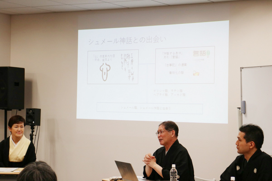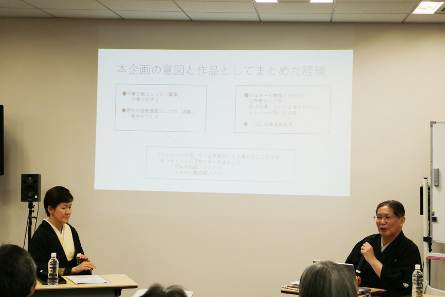「シュメール語はとても日本語に似ています。音韻的にも似ていますし、文法的にも似ています。数年前に英語で能を演じたことがありますが、非常にやりづらい。それは英語が子音で終わる言葉が多いからだと思います。ところが、シュメール語は、ほとんど母音で終わっている。シュメール語を学んだときに、まず『これは謡ってみたい』と思いました。さらにシュメール神話は、本来は口で伝承されたもので、それも歌われていたらしい。ならば、ただ学ぶだけでなく、上演してみる方が、私が長年関心を抱いてきた『心』の問題にも近づけるんじゃないかと考えました」(安田)