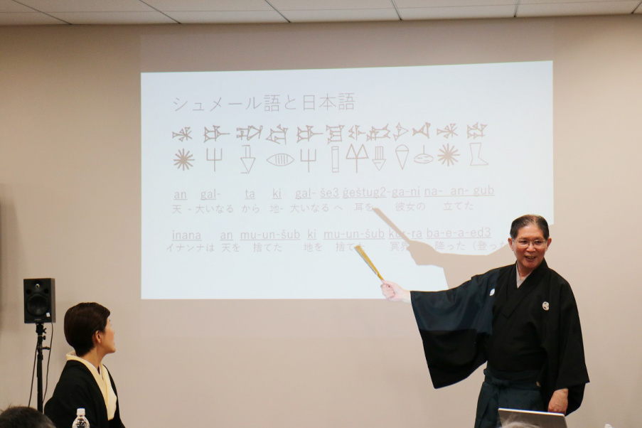 シュメール語と日本語――「一番上の欄が普通の楔形文字です。2段目の段が古拙(こせつ)文字といって、古い楔形文字です。3段目の文字が、その発音です。」