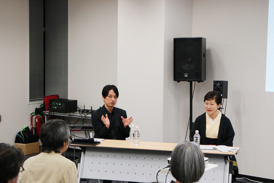 ヲノ「電子の音が生まれたのは、19世紀末から20世紀初頭にかけて。そのとき人々にとってこの音というのは、いわば霊界の音みたいに受けとめられたんです、最初。」 左から:ヲノサトルさん、玉川奈々福さん