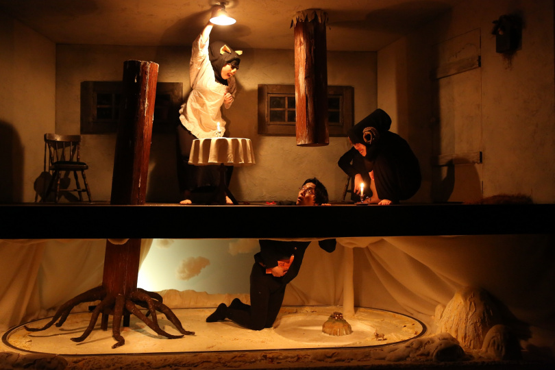 そうしてできあがったのが4面の景を格納した回転舞台『大きなトランクの中の箱』(2013年)。旧「はこぶね」時代の代表作を一つの箱に縮小して格納した同作は、その妄想の強さ、精神分析的なエッセンスを凝縮して見せる一方、盆による転換とも相まって、これまでの閉鎖空間での上演とは異なる大胆さも兼ね備えていた。「この芝居でも舞台美術は稽古の最初の段階からありました。ただ、敢えてつくりこまなかったところもあります。かつての「はこぶね」でやっていたような好き勝手なやり方ではなくて、俳優の身体的特徴だとか、客席からの見え方をきちんと考えるようになった。そういう意味では人情が生まれたというか……当たり前なんですけどね。照明と音響のオペレーターも、常に稽古場にいてもらって、すべてを連動させて動かすようにすることで、かえって無意識なものなんてない、全てが意味を持つ舞台を構成できました」。アーツカウンシル東京の長期助成が採択され、支援が始まったのは、その年の秋のスイス公演からだった(2012年からその直前のヨーロッパツアーまでは単年助成を受けていた)。