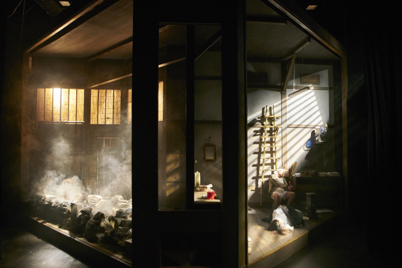 長期助成を得たことで、新たな「はこぶね」を使った創作は、いよいよ「プロジェクト」としての規模を帯び始める。翌2015年に初演された『地獄谷温泉 無明ノ宿』は、前作同様の回転舞台を使った作品で、鄙びた湯治宿に湧き上がる欲望と生への希求を描くもの。これまでとは異なり、稽古初日には台本と美術とがほぼ完成していたことで、タニノは、今まで以上に俳優と向き合い、作品世界を深める時間を持てたという。「物語のリアリティを出すために、俳優には自分の手垢をその空間につけてもらうようにと考えていました。とにかく、そこに住むようにいてほしいと。美術にしても、実際に使われていた古い家具や小道具類を集めて。そういう物に宿った想いをこの作品の中に詰めていこうと考えたんです」。さいたまゴールド・シアター所属の俳優で、この作品で初めてペニノに参加した石川佳代も、「美術、音響、照明だけじゃなく、役者にも、ダメ出しがすごく緻密でした」と振り返る。「言い難いようなセリフもなぜそれがうまく出てこないのか、一緒に考えてくださったり、時には書き直してくださったり。とても丁寧な演出だったと思います」。