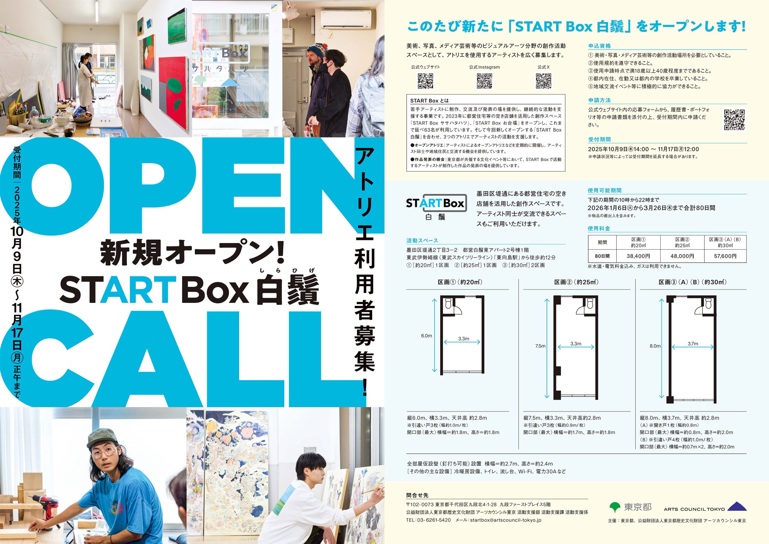 アトリエ等を確保することが難しい若手アーティストに創作場所を提供し、継続的な活動を支援する事業「START Box」を展開しています。この度、墨田区堤通二丁目の都営白鬚東アパートに「START Box 白鬚」を開設します。アトリエに加え、新たに舞台芸術活動を行う方への稽古場も整備しました。これらの施設を利用するアーティストの募集を開始します。