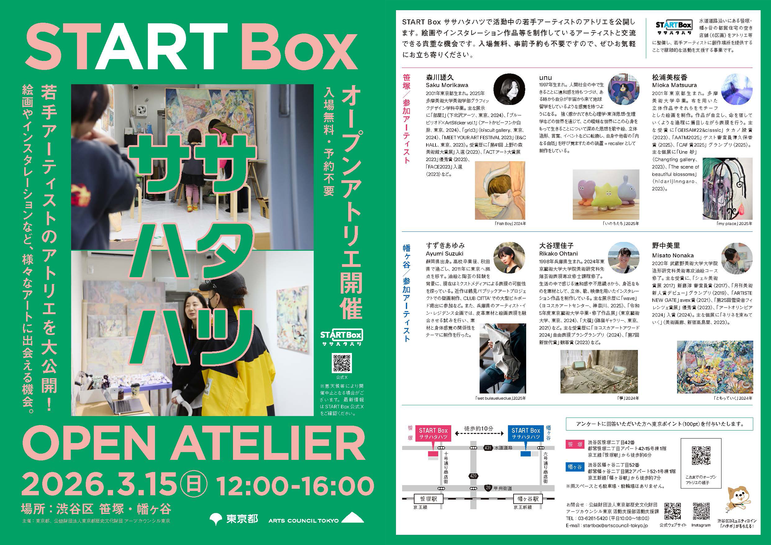 START Box ササハタハツで活動中の若手アーティストのアトリエを公開します。